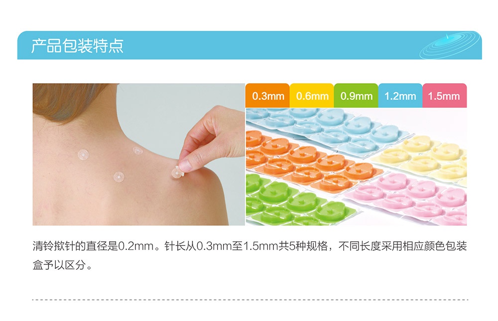 撳針是一種創(chuàng)新型皮內(nèi)針,具有安全,方便,舒適,無創(chuàng)痛等特點(diǎn)。2002年開始研發(fā),2004年正式在日本上市。撳針直徑均為0.2mm。針長從0.3mm至1.5mm共五種規(guī)格。按照日本QMS(醫(yī)療器械生產(chǎn)質(zhì)量管理體系)生產(chǎn)。獲得美國FDA認(rèn)證,歐洲CE認(rèn)證,SFDA認(rèn)證及ISO13485質(zhì)量體系認(rèn)證。